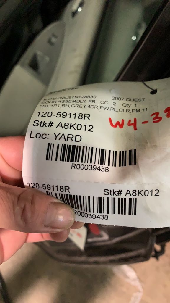 $144.00 Stock#A8K012 Inventory #: R39438 Loc:W4.40D VIN: 5N1BV28U87N128539 Milage: 139275 Source Vehicle Color: GREY Conditions/Options:0S1,1P1,RH,GREYTEST