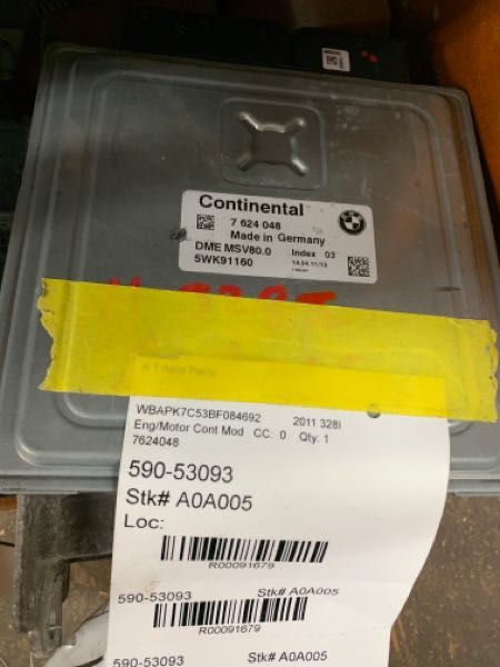 $100.00 Stock#A0A004 Inventory #: R72286 Loc:W1A.BB.4I VIN: WBAPK5C56BA995181 Milage: 128751 Source Vehicle Color: SILVER Conditions/Options:ID: 7624052 Interchange Part Number:590-53095 Hollander Interchange found this part as interchangeable with: BMW 128i 11 Electronic Control Module; (3.0L), N51 engine (MSV80.1 module type), from 12/10; BMW 128i 12-13 Electronic Control Module; (3.0L), N51 engine (MSV80.1 module type); BMW 328i 11 Electronic Control Module; MSV80.1 module type, from 12/10; BMW 328i 12 Electronic Control Module; MSV80.1 module type
