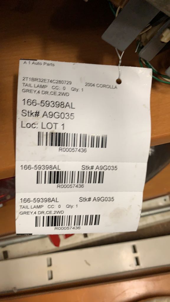 $75.00 Stock#029497 Inventory #: R5164 Loc:W1A.AA.5B VIN: JTDBR32E942029497 Milage: 151546 Source Vehicle Color: BLK Conditions/Options:GOOD Interchange Part Number:166-59398AL Hollander Interchange found this part as interchangeable with: COROLLA 03 quarter panel mounted, L.; COROLLA 04 quarter panel mounted, thru 4/04 (red and amber), L.